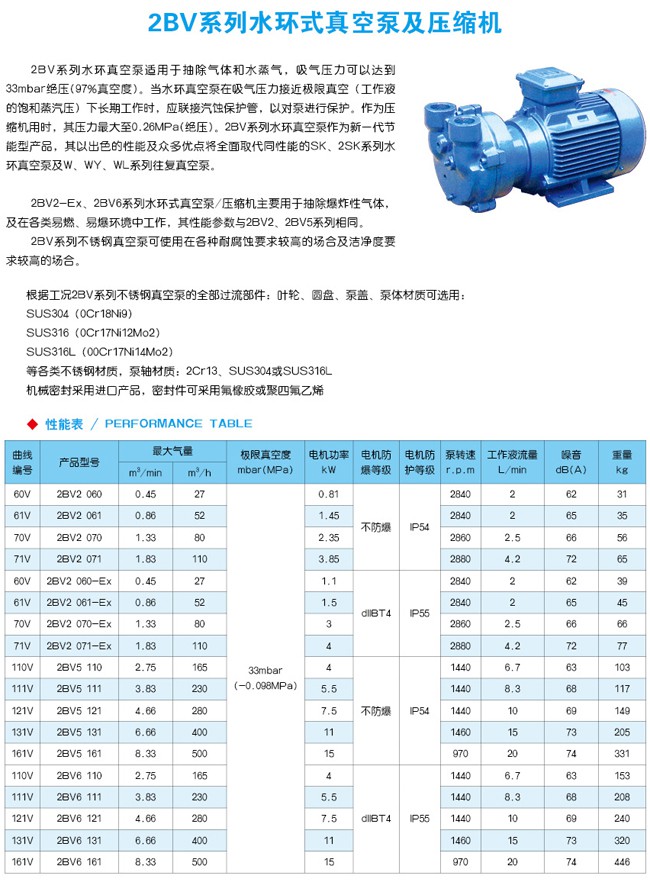 2BV水環(huán)真空泵適用于抽除氣體和水蒸氣,吸氣壓力可以達(dá)到33mbar壓力(97%真空度)。當(dāng)真空泵在吸氣壓力低于80mbar的狀態(tài)下長期工作時,應(yīng)聯(lián)接氣蝕保護管,以對泵進行保護。如配大氣噴射器,吸氣壓力可達(dá)10mbar,噴射器可直接安裝在真空泵上。作為壓縮機用時,其壓力大至0.26MPa。